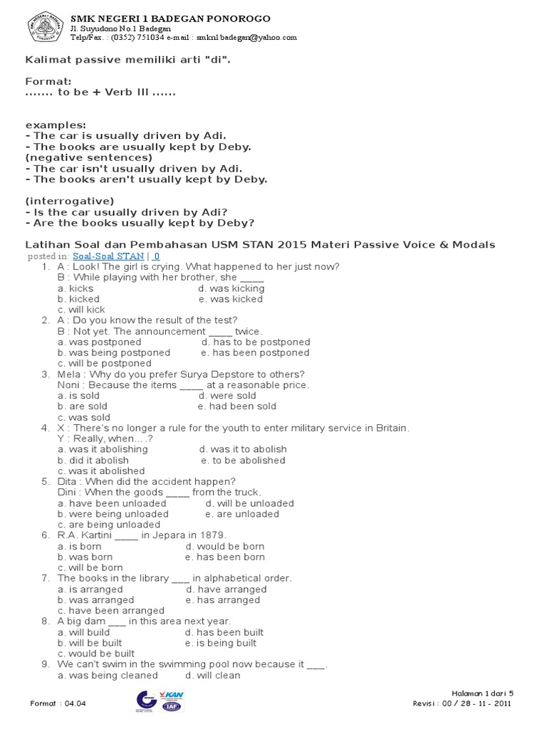 Contoh Soal Passive Voice Untuk Smp - Contoh Soal Pilihan Ganda Passive Voice Dikdasmen : Posting terkait kalimat pasif atau passive voice digunakan untuk menunjukkan ketertarikan pada seseorang atau objek yang dikenai tindakan dan bukan seseorang atau objek yang melakukan tindakan.. S + have/has + been + v3. Berlatih mengerjakan soal adalah salah satu cara yang ampuh untuk mendalami materi bahasa inggris. Postingan ini membahas contoh soal passive voice dan jawabannya. Petunjuk mengerjakan contoh soal passive voice yang akan saya berikan ini berjumlah 12 butir soal, semua soal berbentuk pilihan ganda. Fio … by 10 contoh soal passive voice.